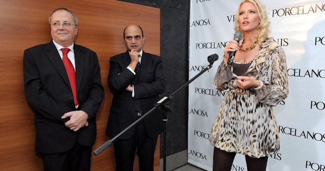 Durante la inauguración Silvestre Segarra –vicepresidente de Porcelanosa Grupo-, Néstor Macagno –representante Sudamérica-, y la modelo Valeria Mazza .