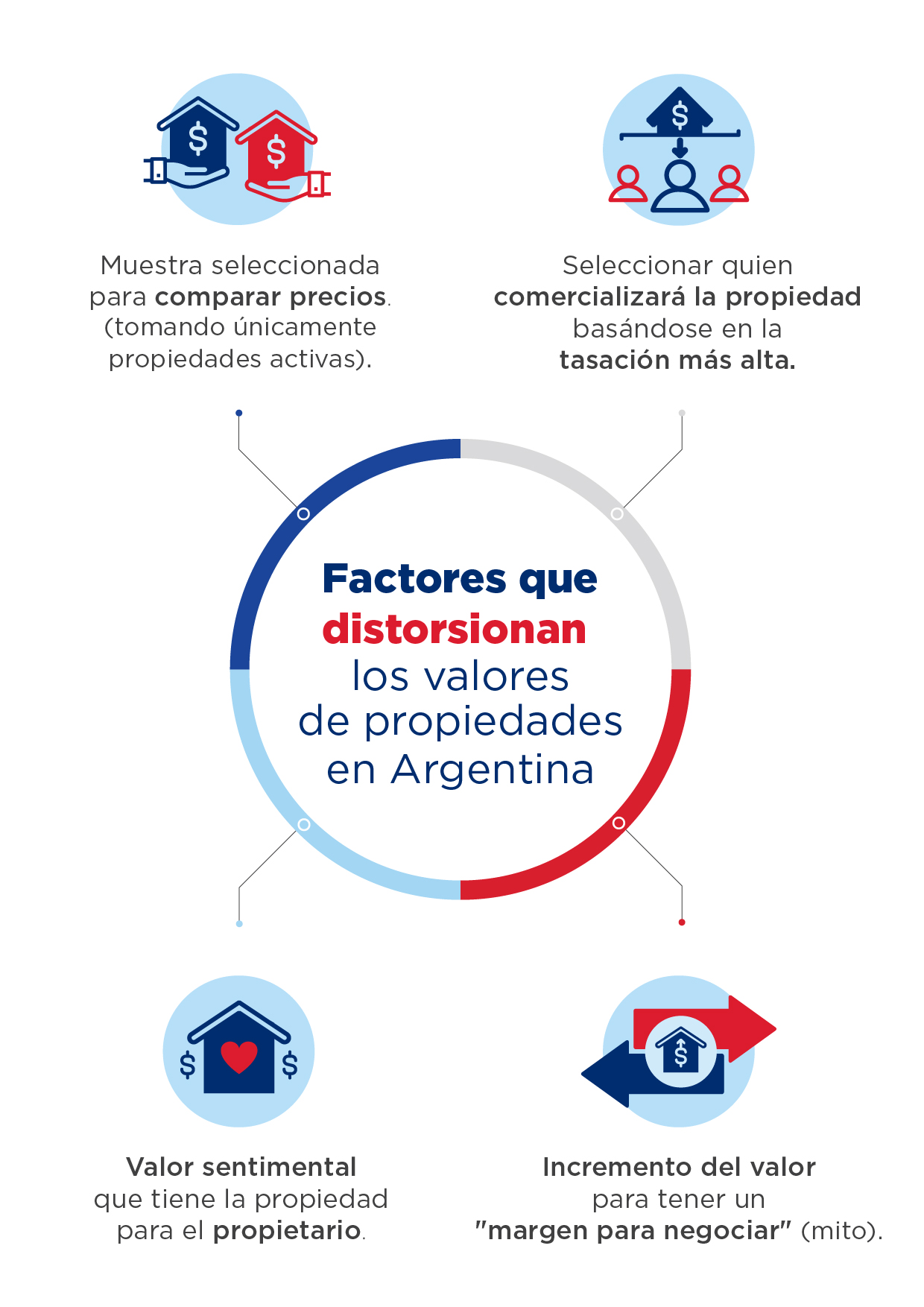 Por un lado, los propietarios eligen la inmobiliaria que mayor ha tasado la propiedad, teniendo en cuenta valores de publicación, y se ponen en juego las opiniones personales sobre lo que consideran que vale su propiedad o lo que necesitan hacer con ese dinero. Estos factores hacen que el valor publicado se aleje del valor real de mercado, y es algo que sucede muy frecuentemente en el mercado argentino.