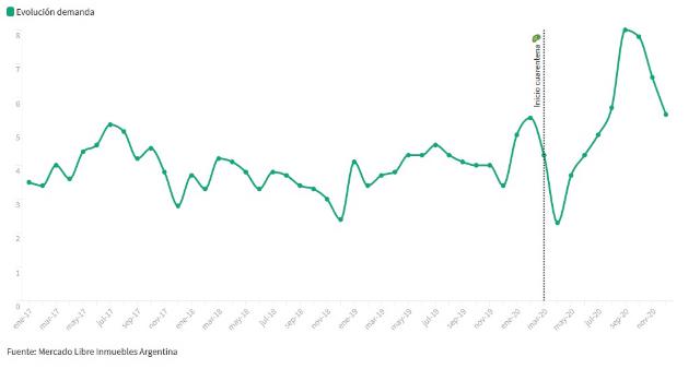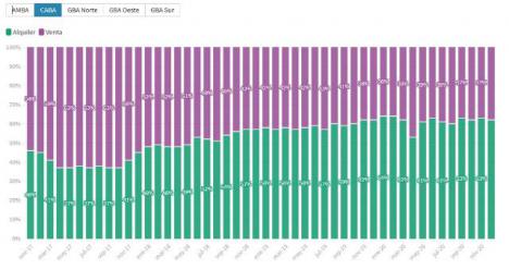 Respecto al tipo de propiedad, se observó un aumento de la demanda de casas determinado por la situación pandémica del país, con un promedio anual del 41%. Sin embargo, los departamentos continúan liderando la demanda en AMBA por amplio margen, principalmente en CABA.