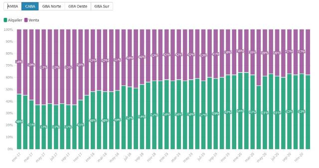 A pesar de la escasa oferta en AMBA, la demanda de alquiler lideró durante el 2020 con un 52% de interés. Exceptuando las primeras semanas de cuarentena donde se observó una fuerte caída, el 2020 estuvo marcado por la prevalencia de alquileres. En términos prácticos, una publicación de alquiler recibió 14,5 veces más de visitas que una publicación de venta.